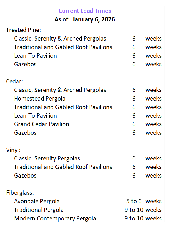 Motor freight delivery: If your pergola is shipped to you via motor freight, once your pergola or pavilion leaves the shop a tracking number will be assigned. We will forward this number to you, and you will be able to see the estimated delivery date by entering your tracking number into the courier website. For residential deliveries, the courier will call you to schedule a specific delivery time (e.g. 3-5pm on Monday, for example). Motor freight carriers deliver M-F 9:00 - 5:00pm.