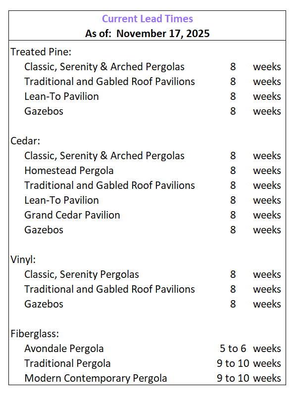 - Above times subject to your prompt approval of shop drawings (see below).- Additional time is needed if you require engineered (sealed) drawings.- Add 1-10 days to the above times for transit time to your home.- Please do not make reservations with contractors or plan social events aroundyour structure, or plan/take days off from work, until your structure is delivered to your home.